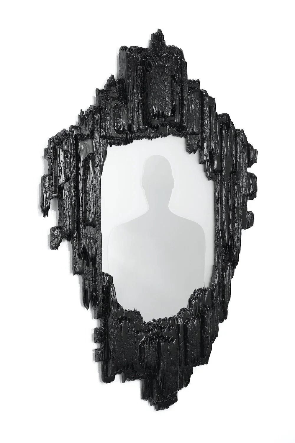 Carved poplar, ink, resin, sandblasted mirror